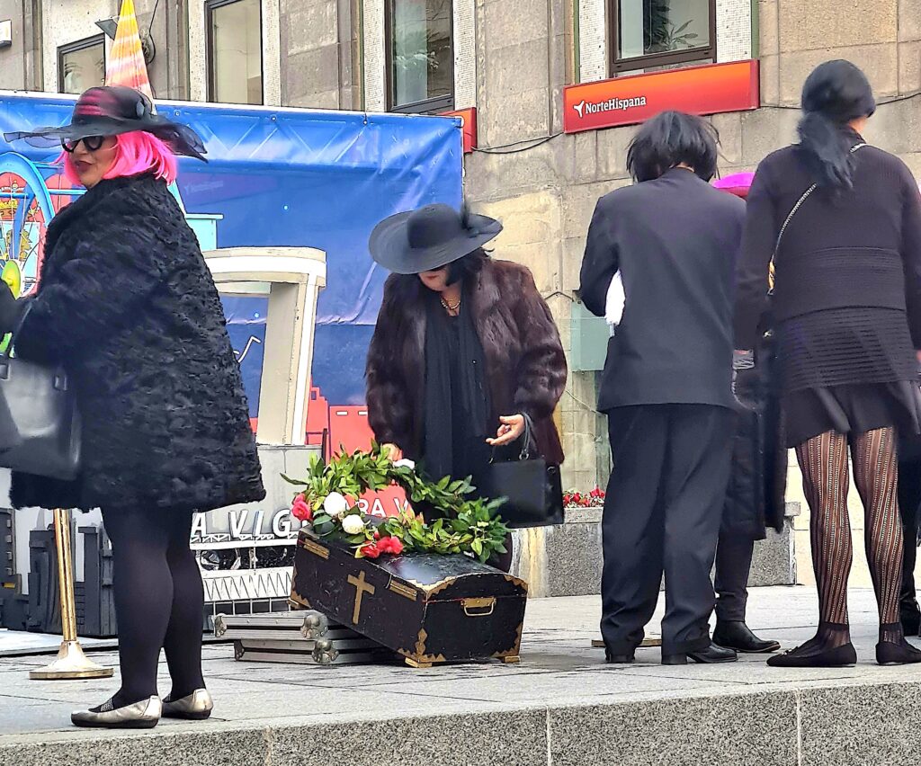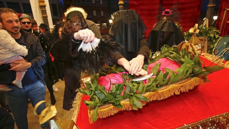 Jednym z najbardziej charakterystycznych momentów kończących karnawał jest „Entierro de la Sardina” — czyli „Pogrzeb sardynki”. To pełna ironii i teatralności ceremonia, będąca parodią prawdziwego pogrzebu. Uczestnicy, często ubrani na czarno, z przesadnie poważnymi minami, odprowadzają gigantyczną kukłę sardynki na miejsce symbolicznego spalenia.