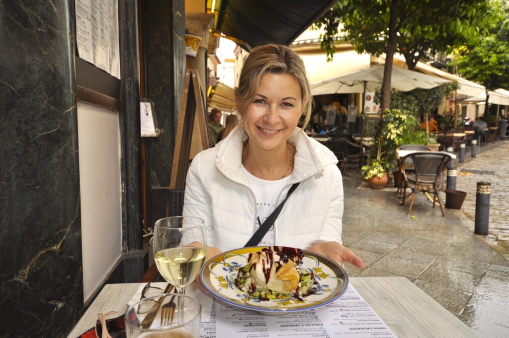 To temat, który szczególnie nas interesuje. Podróżując zawsze staramy się próbować lokalnej kuchni i tym razem również zrealizowaliśmy nasz plan kulinarny w 100%. Pierwszego dnia na lunch wybraliśmy restaurację „El Aguador Puerta Oro” aby spróbować kilku dań w formie tapas, m.in. patatas bravas, barenjena con miel (bakłażan z miodem), boquerones fritos (małe, smażone rybki), calamares con verduras i ensalada con queso de cabra (sałatka z kozim serem). Wszystko smaczne i świeże w towarzystwie hiszpańskiego, czerwonego wina Rioja.
