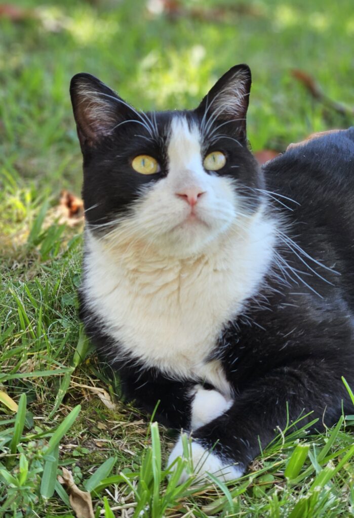Ostatnio zamieszkał w naszym ogrodzie młody kocurek, którego najprawdopodobniej ktoś wyrzucił. Jest bardzo „miziasty” i lgnie do człowieka. Próbuję znaleźć mu domek, ale póki co bez powodzenia. Czy dołączy do naszej gromadki? Zobaczymy…